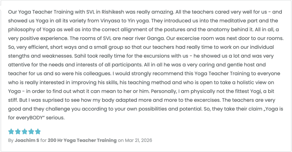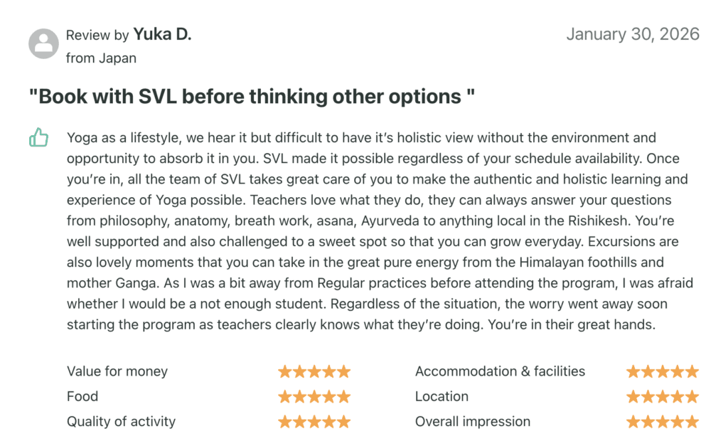 Yoga as a lifestyle is hard to absorb alone, but SVL makes it possible regardless of your schedule. Once you arrive, team ensures an authentic, holistic experience. Even if youโve been away from practice and fear being 'not enough,' those worries vanish here. You are in great hands.Between the pure energy of Mother Ganga and Himalayan excursions, you will find the environment you need to truly transform.