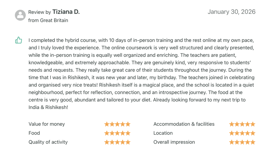 I completed the hybrid course, and I truly loved the experience. The training is well organized and enriching. The teachers are patient, knowledgeable, and extremely approachable. They are genuinely kind, very responsive to studentsโ needs and requests. Rishikesh itself is a magical place, and the school location is perfect for reflection, connection, and an introspective journey. Already looking forward to my next trip to Rishikesh.