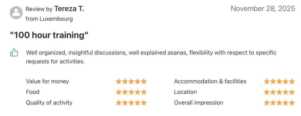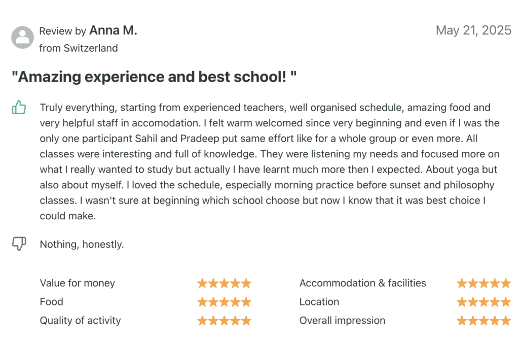 Amazing experience and best school! Truly everything, starting from experienced teachers, well organised schedule, amazing food and very helpful staff . I felt warm welcomed since very beginning. All classes were interesting and full of knowledge.I have learnt much more then I expected. About yoga but also about myself. I wasn't sure at beginning which school choose but now I know that it was best choice I could make.