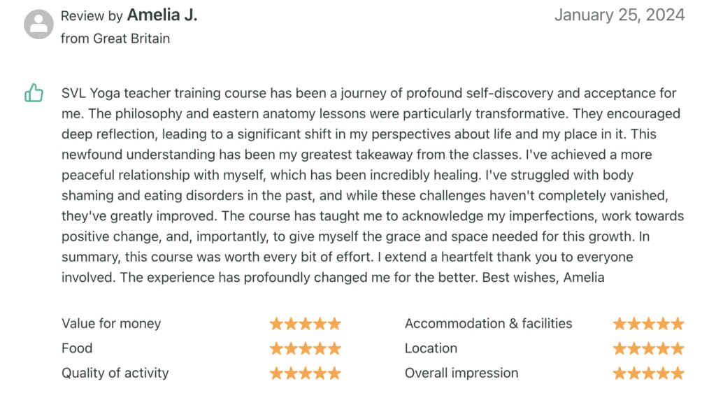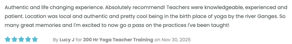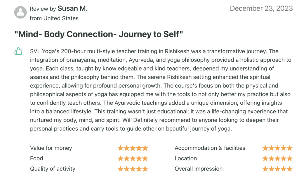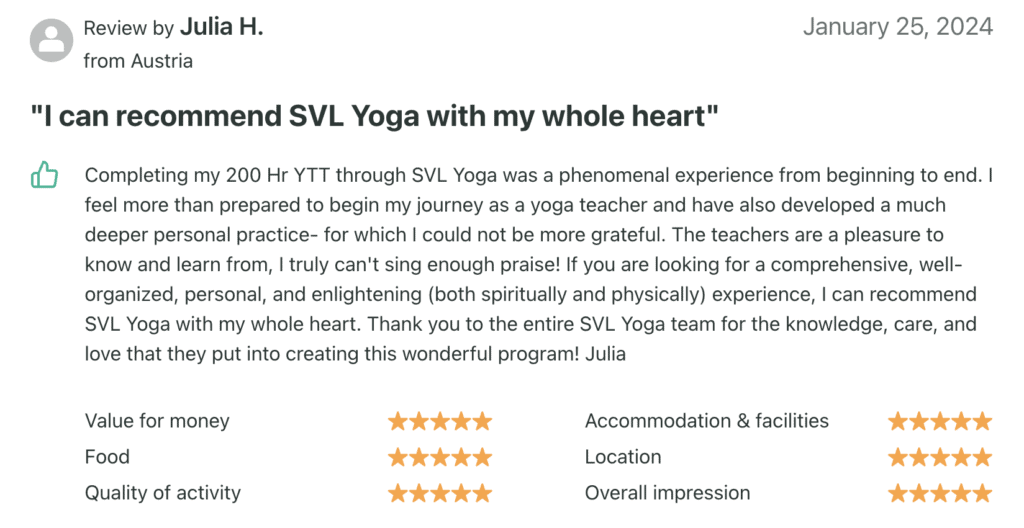 Authentic and life changing experience. Absolutely recommend! Teachers were knowledgeable, experienced and patient. I loved the schedule, especially morning practice, before sunset and philosophy classes. Location was local and authentic and pretty cool being in the birth place of yoga by the river Ganges. So many great memories and I'm excited to now go a pass on the practices I've been taught! I will come back to SVL Yoga.